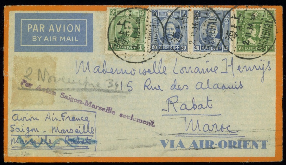 1934 (2 Nov.) airmail to Morocco bearing Dr. S.Y.S. 4c, 20c (2), Martyr 50c tied by Shanghai c.d.s., with postal instruction "par Avion Saigon-Marseille" h.s. in purple, Marseille transit (19.11) and Morocco arrival (24.11)