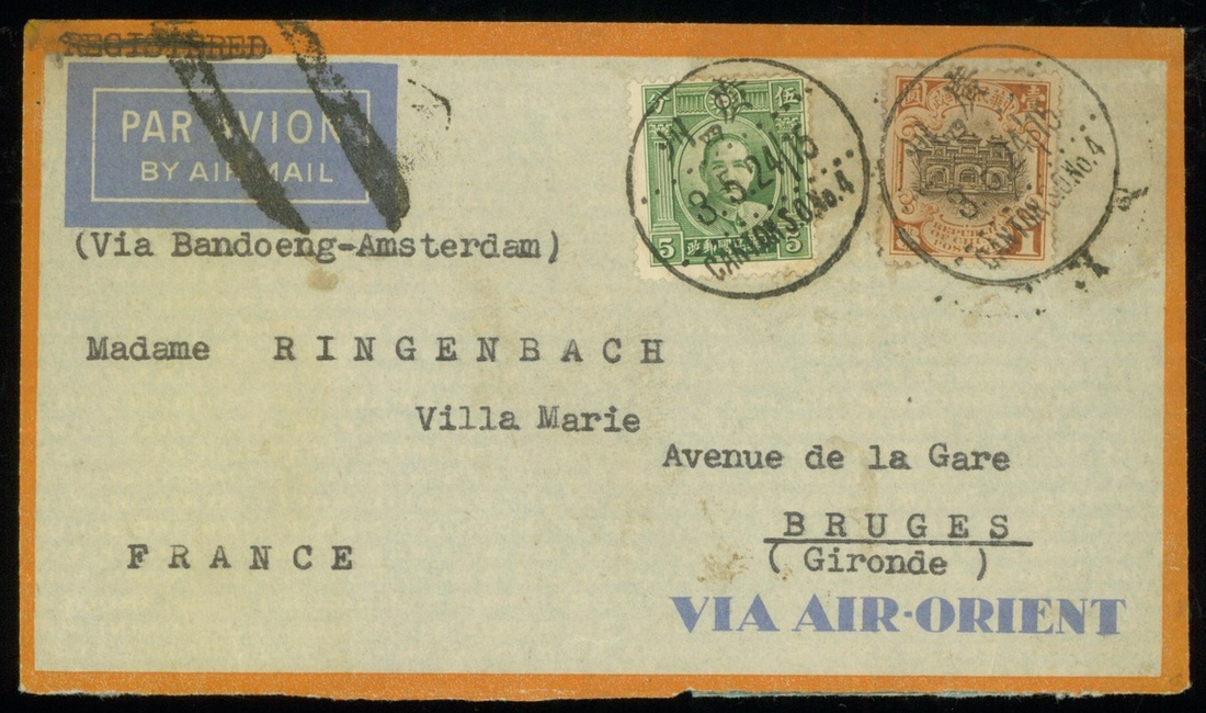 1935 (3 May.) cover from Canton to France, bearing Dr. S.Y.S. 5c. and Hall of Classics $1., tied by Canton c.d.s., Canton transit and France arrival c.d.s. on reverse.
