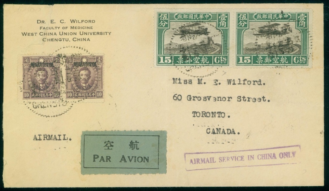 1935 (5 Mar.) airmail to Canada bearing Air Mail 15c (2), Martyr "for use in Szechuan" ovpt. 10c (2) tied by Chengtu c.d.s., with rectangular postal instruction h.s. and Shanghai transit (8.3).