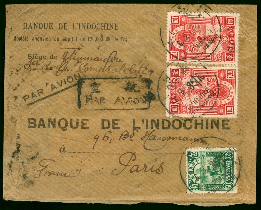 1936 (6 Feb.) Yunnan to France Air Mail Commercial cover, frinked with $1 New Life pair, 50c. Reaper, and on reverse 5c. London SYS, 30c. Reaper, tied by Kunming (Yunnanfu) c.d.s., Sent by surface-mail to and transit by Hanoi and Hokow. fine