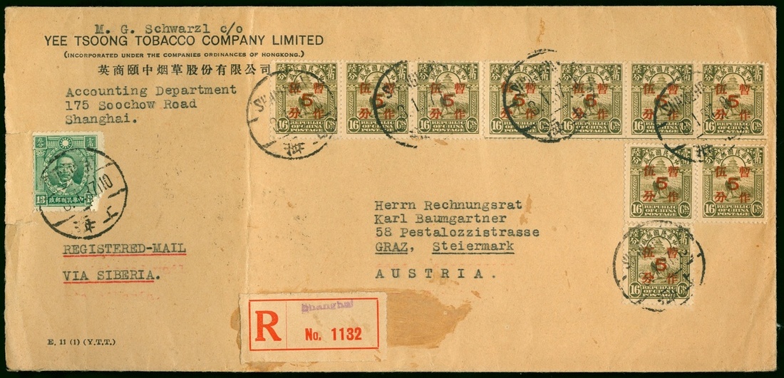 1937 (3 Jan.) Shanghai to Austria registered cover, bearing Farmer reaping overprint 5c. (10), Martyrs 13c.(1), tied by Shanghai bilingual c.d.s., on the reverse with stamp fall off and 20 Jan.Wien srrival c.d.s.