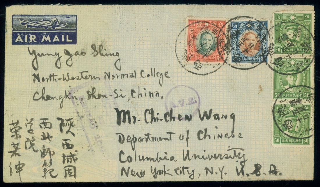 1941 (10 May.) airmail to U.S.A. bearing Dr. S.Y.S. $2, $5 and Martyr 50c (3) tied by Nancheng c.d.s., with Hong Kong transit c.d.s. (16.5) on reverse. Front with "A.V.2" and "Not Open by Censor" h.s. in purple.