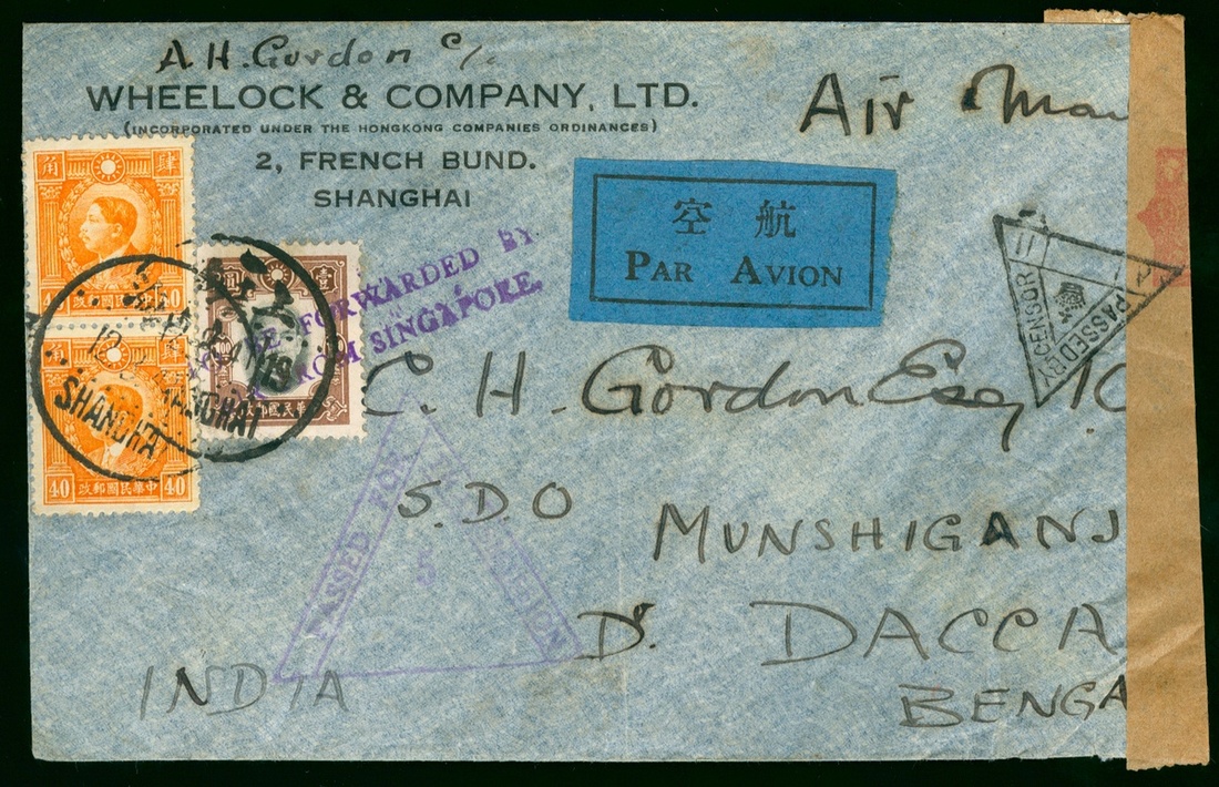 1941 (12 Aug.) Shanghai to India Air Mail cover, bearing Dr.Sun $1. and Martyr 40c.(2), tied by Shanghai c.d.s., transit by Hong kong, Singapore with "passed for transmission 5" and passed by censor chop. On reverse with India Munshiganj 5 Sep. arrival c.d.s.