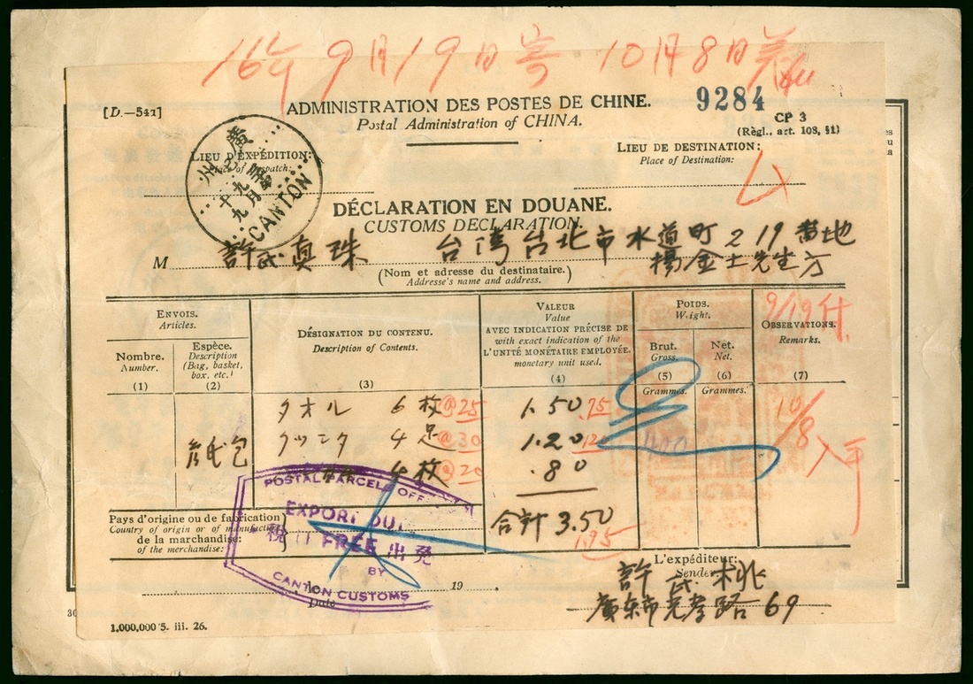 1941 (19 Sep.) a parcel receipt and customs declaration receipt to Taipei tied by Canton c.d.s.