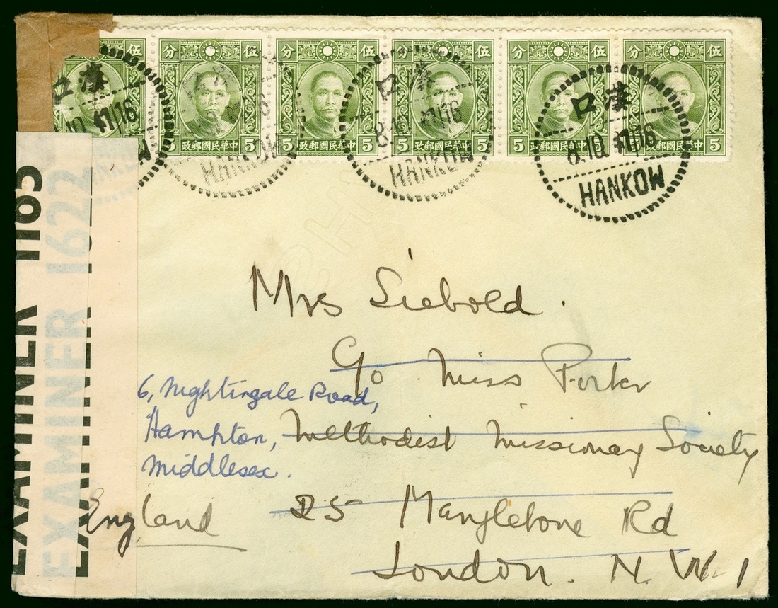 1941 (8 Oct.) a censor air mail cover to England bearing SYS Chung Hwa $5 strip of six tied by Hankow c.d.s.,on reverse bearing strip of four, uncancelled, 3rd stamp with “Dot on 5” variety, cover sealed 2 censor labels, London(8 Jan.) arrival c.d.s.
