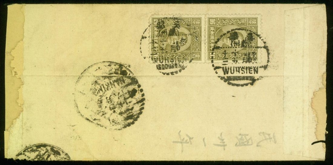 1942 (15 Apr.) Soochow to Sihsien red band envelope, bearing Dr.Sun 16c.(2), tied by Wuhsien (Soochow) bilingual c.d.s., with Nanking transit c.d.s., and arrival c.d.s.