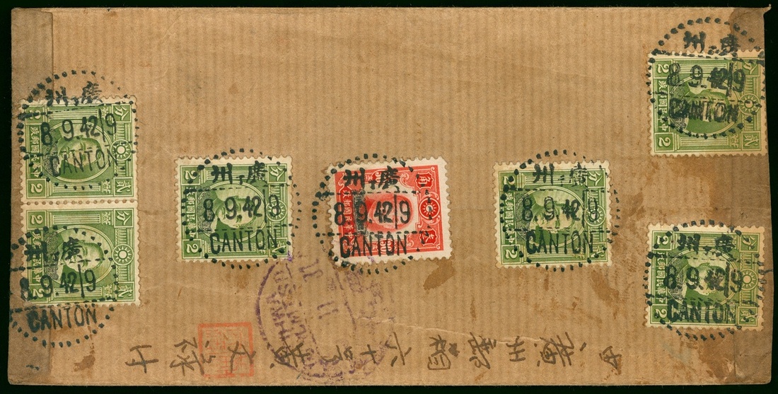 1942 (8 Sep.) Canton to Tihwa regiistered cove, on reverse bearing " Special For Use In Kwangtung District" Overprint Dr.Sun 2c. (6), 30c.(1), iied byCanton c.d.s., with Tihwa 31 Nov. arrival c.d.s., on address side with Canton registered hangchop in red.