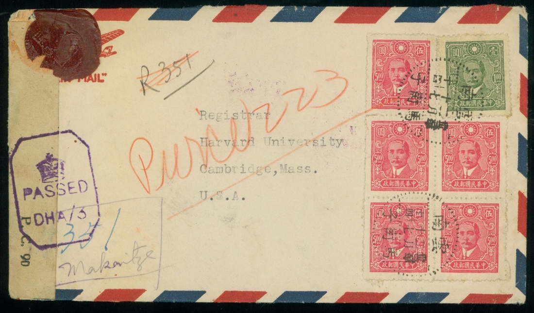 1944 (17 Feb.) Makiatze, Yunnan to U.S.A. Air Mail registered cover, bearing Dr.Sun $5.(5) and $1.(1), tied by Makiatze c.d.s., transit by Miami on 31 Mar., Cambridge 1 Apr. arrival c.d.s. beside. Letter opened by examiner at India.