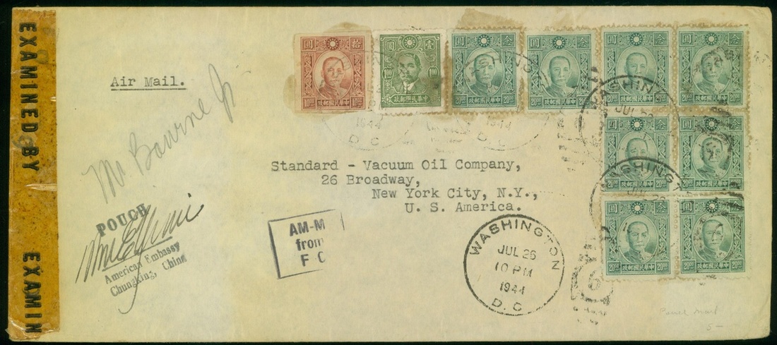 1944 diplomatic airmail from Standard - Vacuum Oil Company in Chungking to their office in U.S.A. bearing Dr. S.Y.S. (10) tied by Washington c.d.s. (26.7) with American Embasy in Chungking h.s. and signature and "AM-M From F C" h.s., censor label, fine.