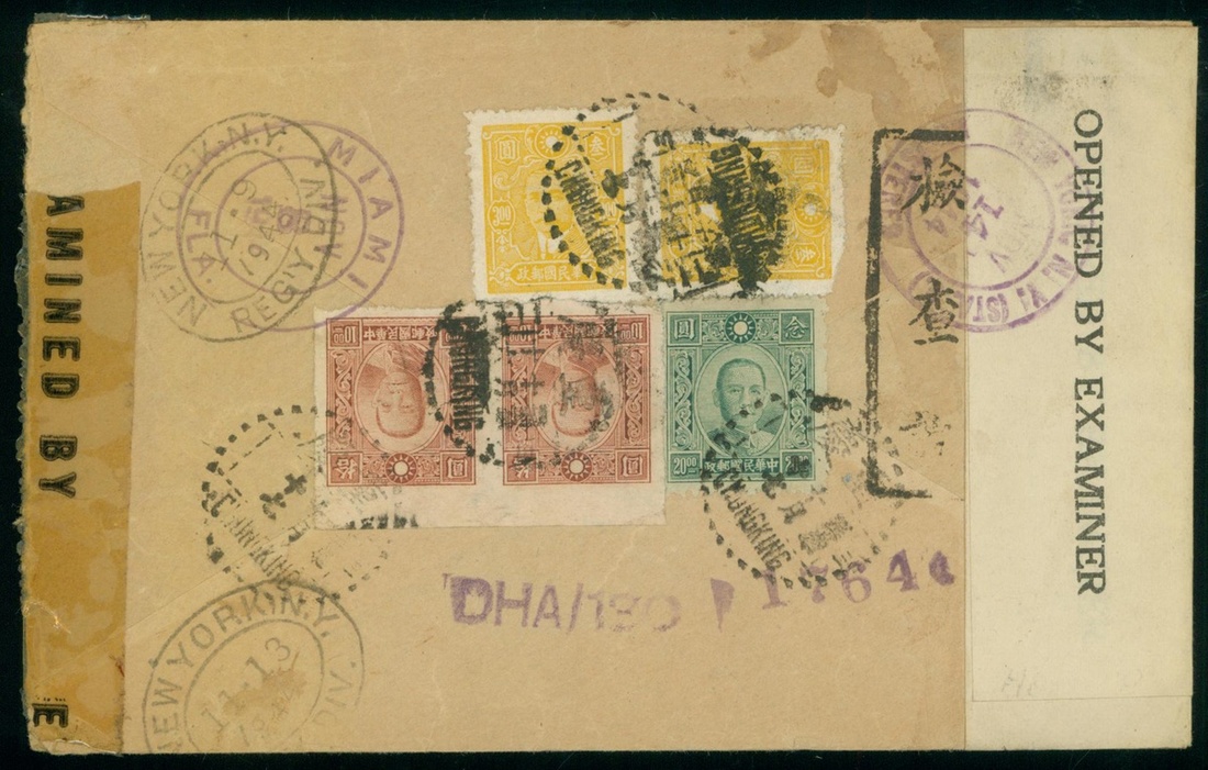 1944 (17 Oct.) registered airmail to U.S.A. bearing Dr. S.Y.S. $3 (2), $10 (2), $20 tied by Chungking c.d.s., with censor label and seal, transit Miami (8.11) and New York arrival (9.11), further two censor labels adhesive during transit in U.S.A., rare mail with several censor labels.