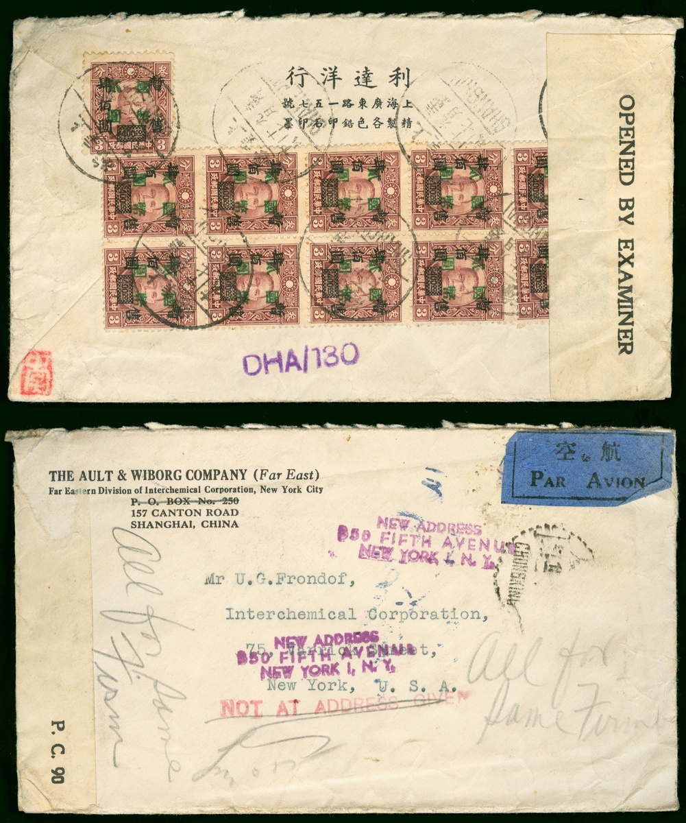 1945 (17 Sep.) airmail to New York, on the reverse bearing Dr S.Y.S. $2 on 3c (11) tied by Shanghai bilingual c.d.s., the front with Chungking transit (22.9) and "Not at Address Given" h.s. in red, with censor label and seal. Fine.