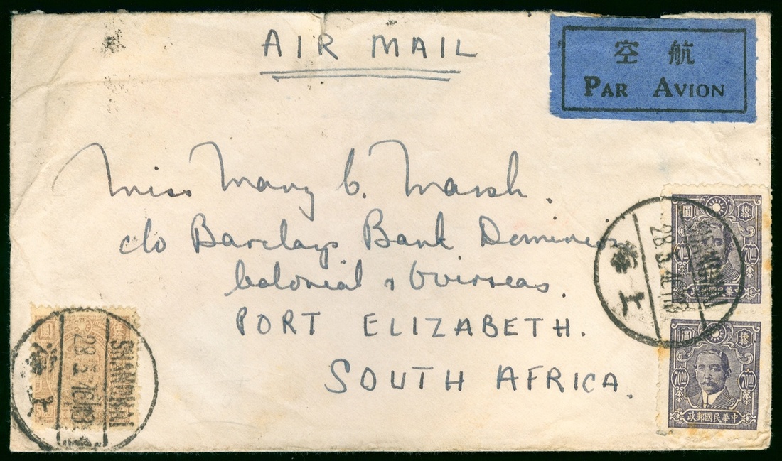 1946 (27 May) an air mail cover to South Africa bearing Victory $300 x 5 tied by Shanghai c.d.s., other $50 and $70 pair tied by 28 May c.d.s.