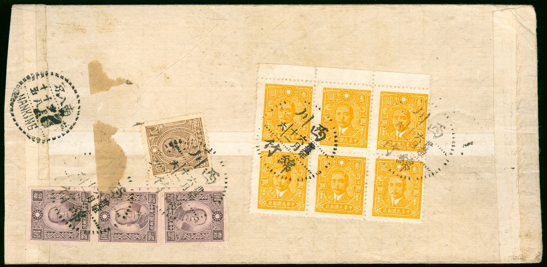 1946 (11 Jun.) Mienchu to Nanking AirMail registered red band envelope, onthe reverse bearing Dr.Sun franking $110., tied by Mienchuc.d.s., alongside with Nanking 18 Jun. arrival c.d.s.