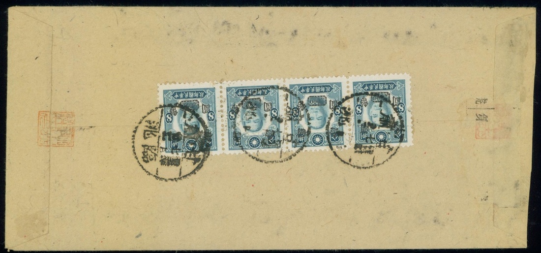 1946 (22 Jul.) registered airmail to Nanking bearing Dr S.Y.S. $20 on 8c in stripe of four tied by Lintao c.d.s., with Lanchow and Chungking transit c.d.s. and Nanking arrival. Scarce and fine.