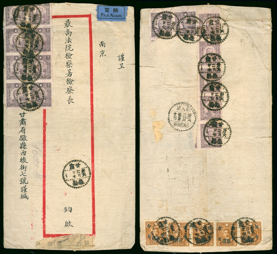 1947 (27 Feb.) Hweihsien, Kansu to Nanking red band envelope, on the reverse side, bearing Dr.Sun $30.(15), Martyrs surcharged $20.(5), tied by Hweihsien c.d.s., 5 Mar. Nanking arrival c.d.s. alongside.
