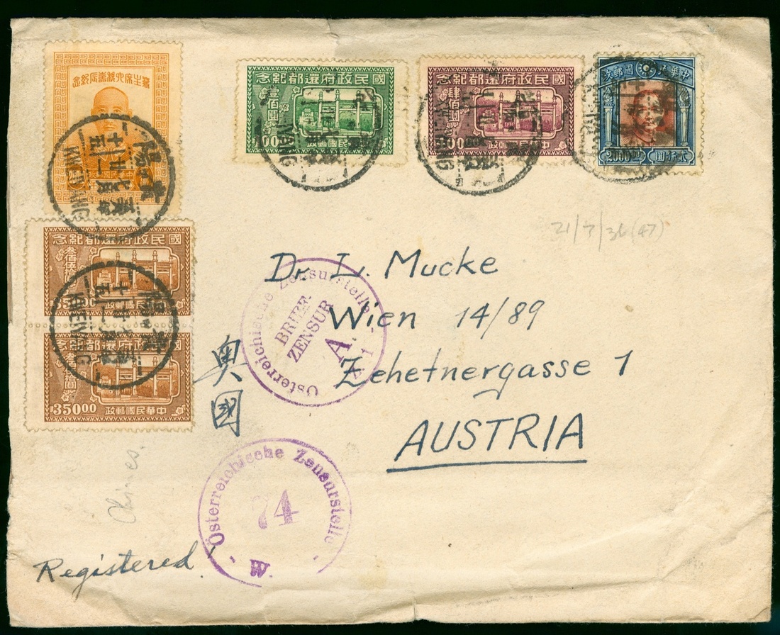 1947 (21 Jul.) a registered cover to Austria total rate $3400 tied by Kweiyang bilingual c.d.s. and Austria two censor marks.