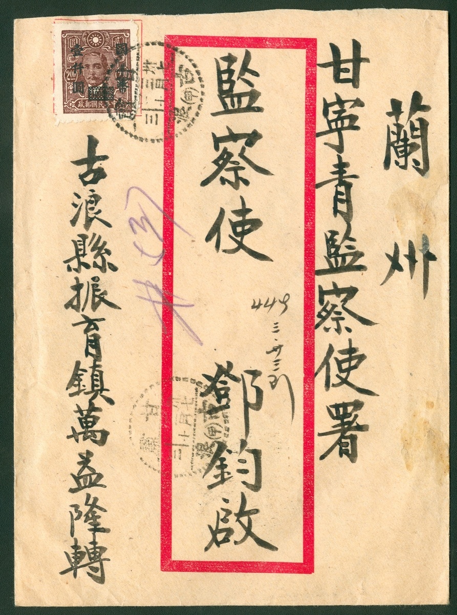 1948 (20 Mar.) a registered cover to Lanchow bearing SYS $1000 and $2000 pair tied by Kansu kulang c.d.s.