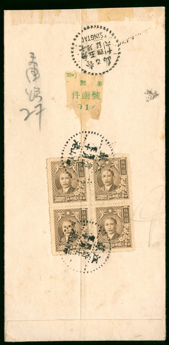 1948 (30 Apr.) an express cover to Tsingtao bearing SYS $5000 block of four tied by Fushankong c.d.s.