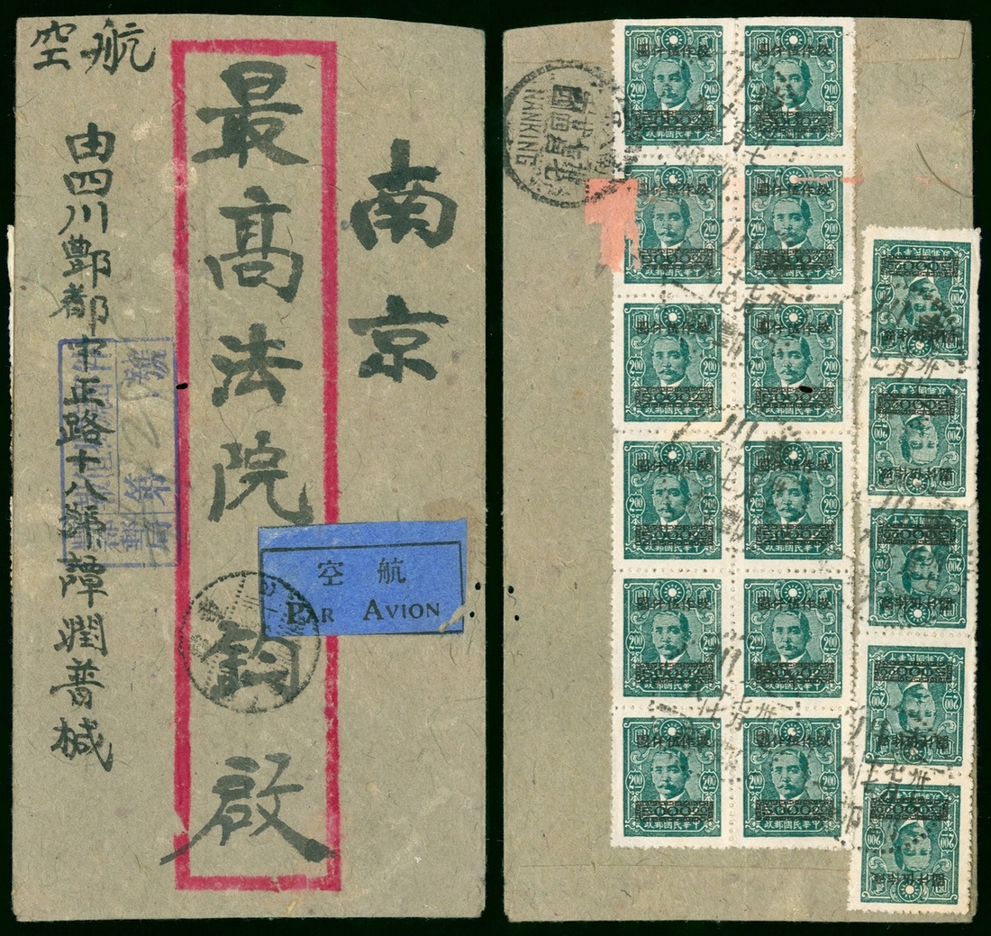 1948 (17 Jul.) an insure registered air mail cover to Nanking bearing SYS $5000 x 17 tied by Fengtu c.d.s.
