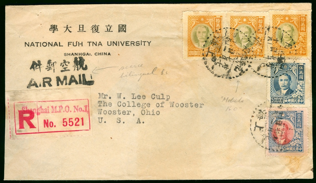 1948 (31 Jul.) a National Fuh Tna University registered air mail cover to U.S.A. bearing $360000 tied by Shanghai Mobile P.O. c.d.s. and registered label.