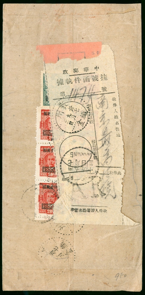 1948 (3 Sep.) a double registered cover bearing $75000 tied by Kweichow Chikum c.d.s.
