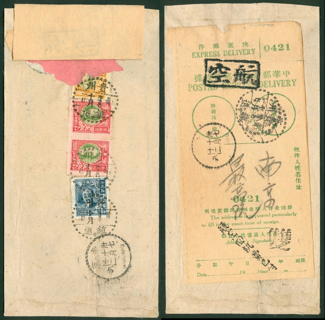 1948 (1 Oct.) a express air mail cover to Nanking bearing SYS $20000 pair,$50000 and $100000 tied by Chenyuan, Kweichow c.d.s.