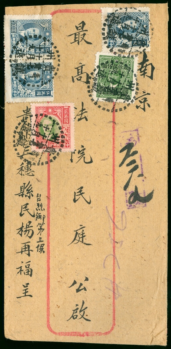 1948 (19 Oct.) a double registered air mail cover to Nanking bearing SYS $5000,$20000 and $50000 x 3 tied by Chenyuan, Kweichow c.d.s.