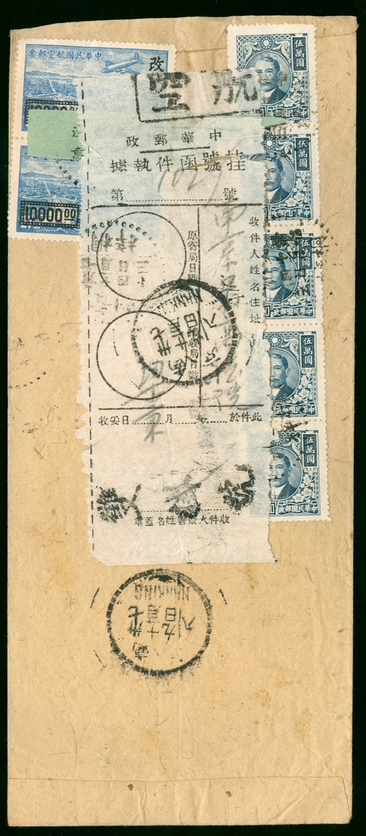 1948 (4 Nov.) a double registered air mail cover to Nanking total rate $270000 tied by Tungtze, Kweichow c.d.s.