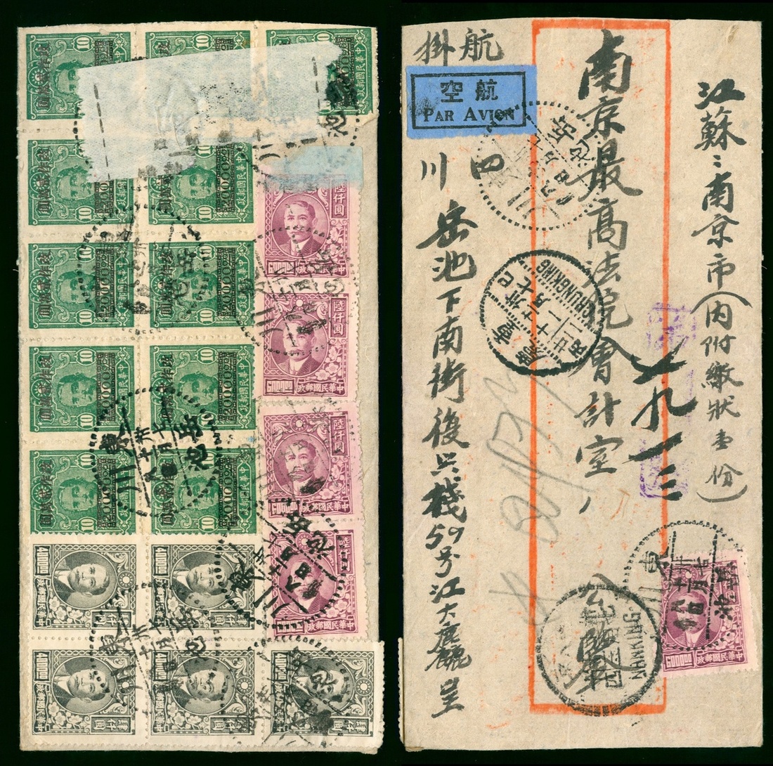 1948 (8 Nov.) a registered air mail cover to Nanking bearing various SYS issues total rate $270000 tied by Yochih c.d.s.