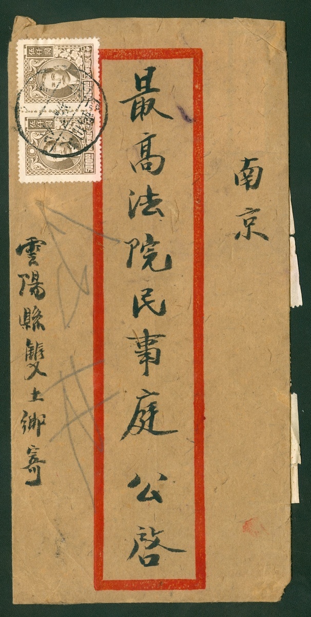1948 a registered cover to Nanking bearing SYS $1000 x 15 and $5000 pair tied by Kinan postal agent round chops, two stamps damaged.