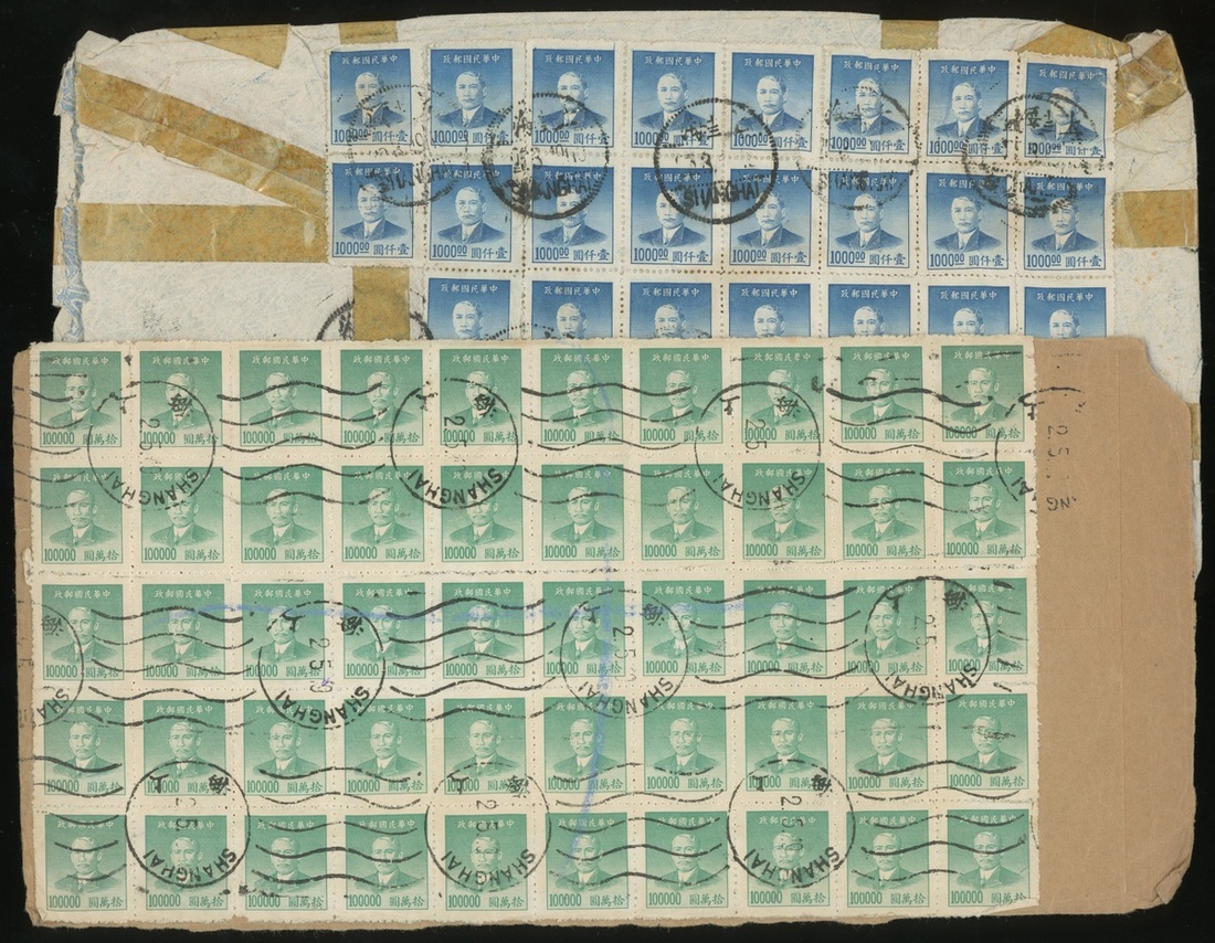 1949 (25 Mar.) airmail cover to U.S.A bearing Dr. S.Y.S. gold yuan issue $1000 in block of thirty six; 1949 (2 May.) Dr.S.Y.S. gold yuan issue $10000 in block of fifty on piece tied by Shanghai cancellation. fine.