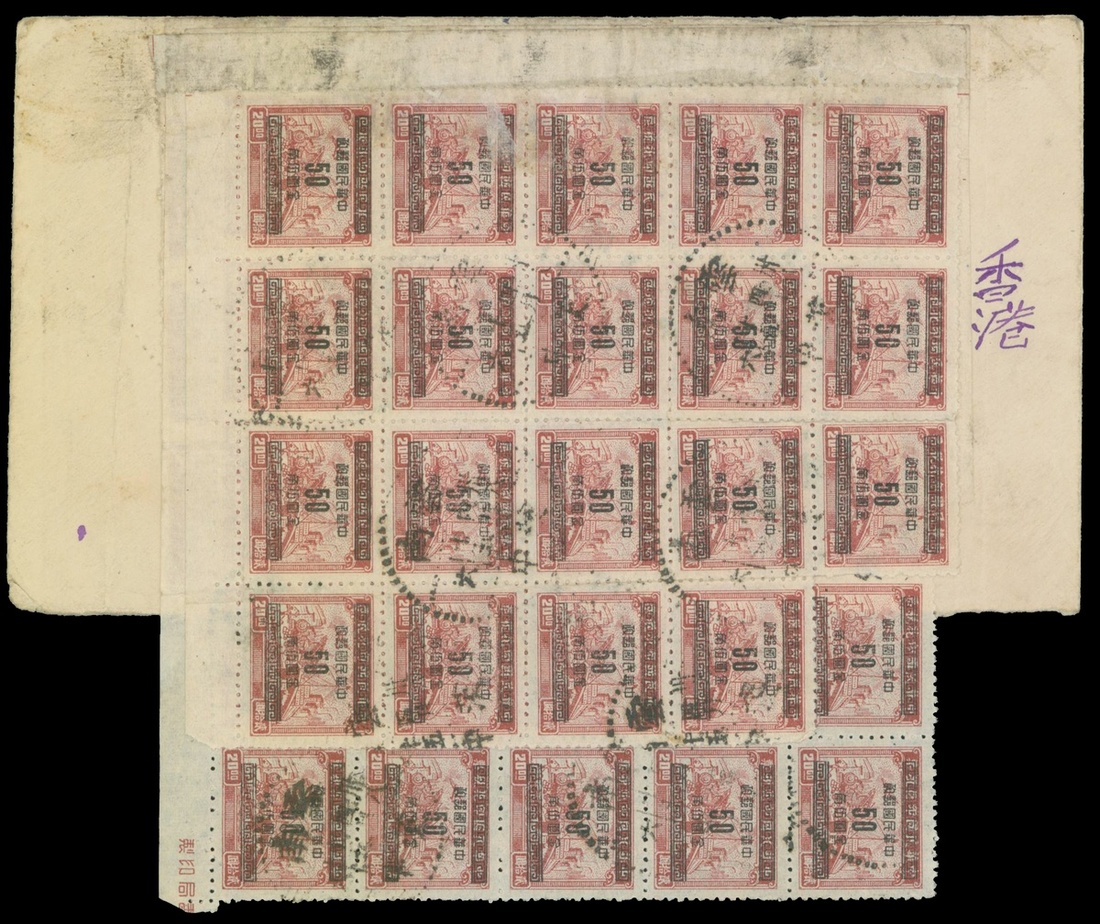 1949 (15 Apr.) envelope to Hong Kong bearing Revenue stamps surch. with gold yuan 50c on $20 (59) incl. large block, tied by Tzechung c.d.s., and with Kunming transit (16.4).