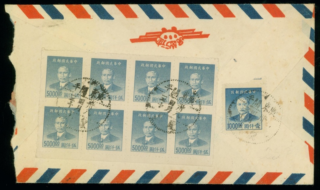 1949 (30 Apr.) airmail envelope to U.S.A. bearing Dr S.Y.S. Gold Yuan Issue $1000 and $5000 in block of 8 tied by Hoiping Shushan Chinese c.d.s. with "Wing Wu Co. Sue Sun Hoi Ping Canton China" postal agency h.s. Fine.