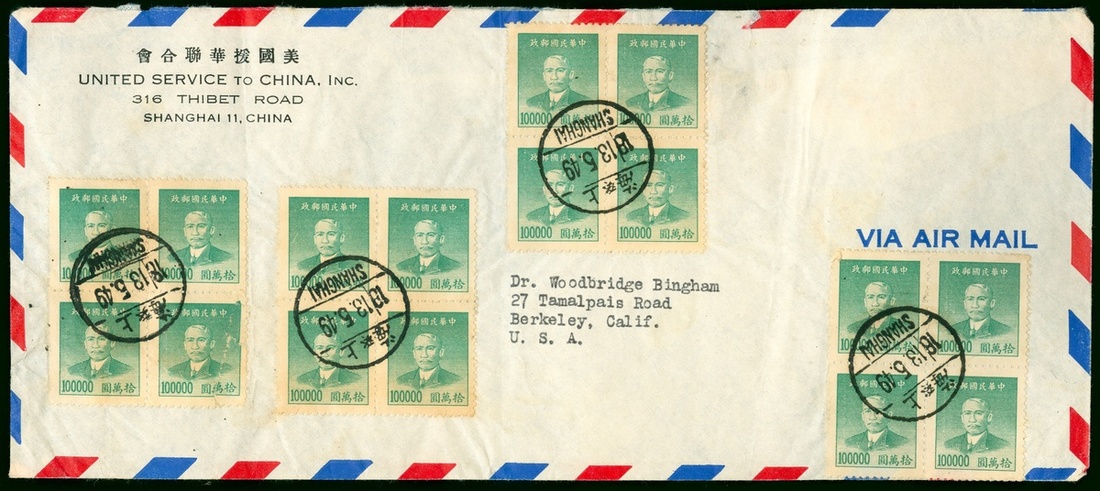 1949 (3 May) Shanghai to U.S.A. air mail cover, bearing Dr.Sun $100,000.(16), tied by Shanghai bilingual c.d.s., fine.