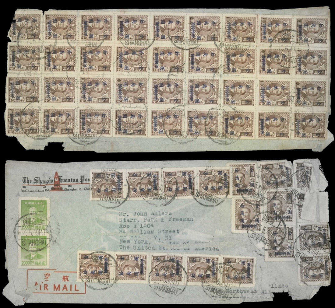 1949 (7 May.) airmail to U.S.A. bearing Dr S.Y.S. with gold yuan currency surcharge $100000 on $30000 (54) and gold yuan issue $20000 (2) tied by Shanghai c.d.s. Fine.