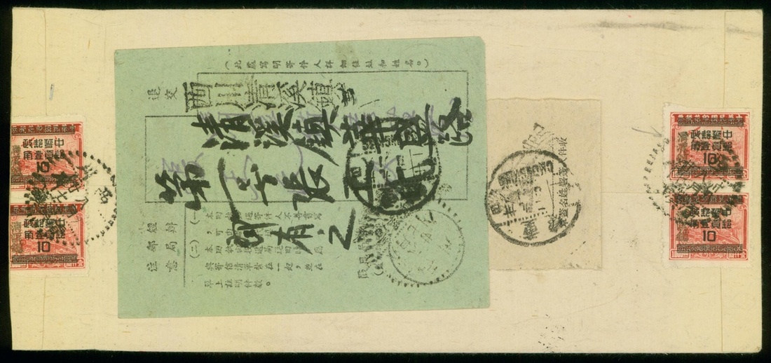 1949 (27 Aug.) double registered cover to Chungking, on reverse bearing Revenue Surcharge for use as Silver Yuan 10c on $1000 (4) tied by Tsingki, West Szechuan c.d.s, with complete registration label and receipt, Chungking arrival (2.9).