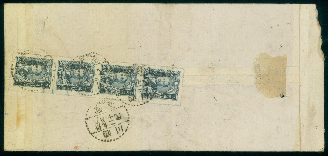 1949 (12 Sep.) registered envelope to Chungking bearing Dr. S.Y.S. domestic ordinary unit stamp ovpt. on $50000 (4) tied by Yibin postal agency c.d.s., with Chungking (22.9) transit and Hwangchushu arrival (23.9)