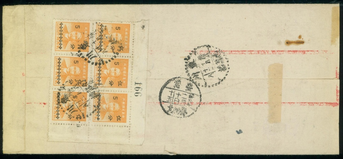 1949 (12 Oct.) registered airmail to Canton bearing Dr. S.Y.S. surcharged with silver yuan currency 5c on $2000 in block of six with imprint margin tied by Eastern Szechwan Hwalungkiao c.d.s. with Chungking (13.10) (16.10) and next year Taiwan (10.2) transit c.d.s. Due to the Chinese People's Liberation War, the Communist going to take over Canton and finally under their control on 14 Oct 1949, this cover has to stay at Chungking with two transit c.d.s and then forward to Taiwan for transit after a long delay. An interesting cover showing the Liberation history of Canton.