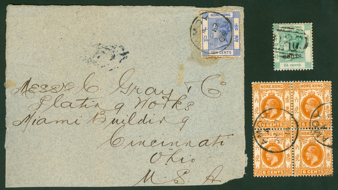 1880 -1914 Hong Kong used stamps, including 3 QV stamps, 2 cancelled by D27 & 1 cancelled by B62 postmark, 1 QV stamp used on piece, tied by AMOY c.d.s., 2 KGV block of 4 stamps tied by AMOY c.d.s.