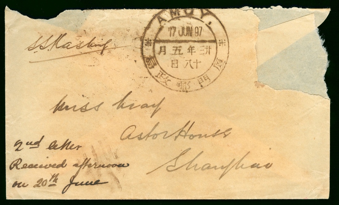 1897 (17 Jun.) a cover from Amoy to Shanghai, stamp cut off, Amoy dollar dater alongside.