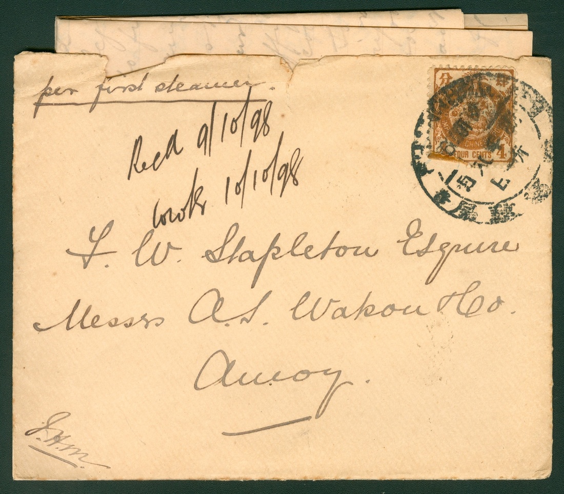 1898 (6 Oct.) a cover with content to Amoy bearing I.C.P. 4c. tied by Shanghai dollar dater c.d.s., on reverse with Amoy(9 Oct.) arrival dollar dater c.d.s.