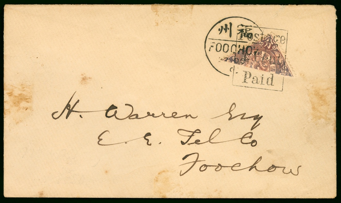 1903 (22 Oct.) a coiling dragon bisect cover 2c. tied by boxed "Postage 1 Cent Paid” and Foochow bilingual c.d.s. to local.