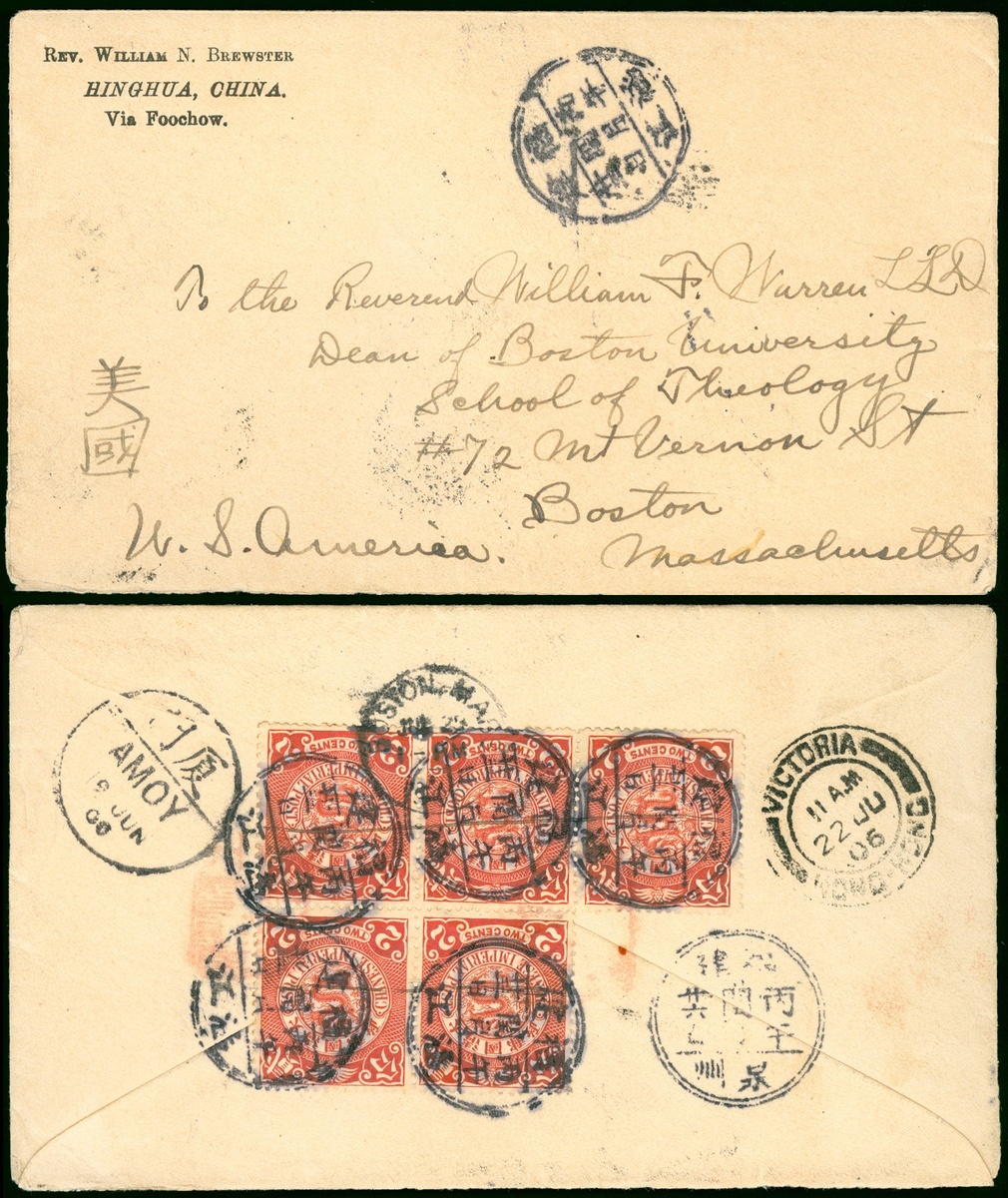 1906 (14 Jun.) envelope to Boston, on the reverse bearing C.I.P. coiling dragon 2c in block of five tied by Chuanchow tombstone postal box h.s. in red and Hankong c.d.s., with Chuanchow, Amoy (19.6) , Hong Kong (22.6) transit c.d.s. and Boston arrival (29.7). Fine and scarce.