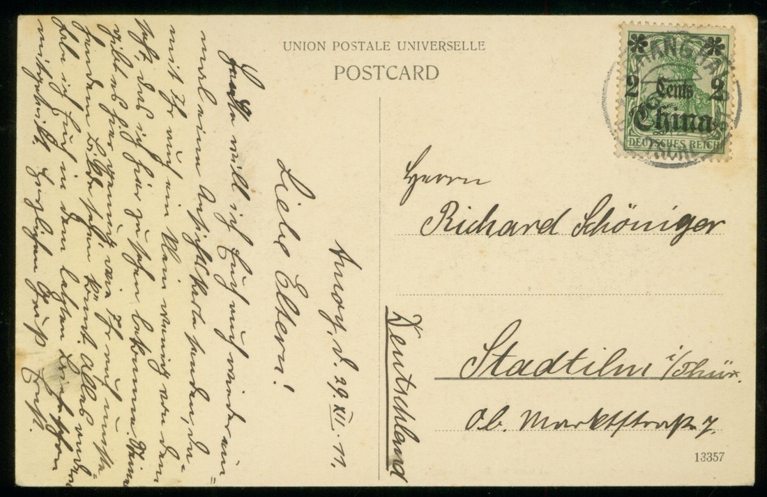 1912 (6 Jan.) Ten Thousand Rock Temple, Amoy postcard bearing German Post Office in China 2c. tied by Shanghai c.d.s. to Germany