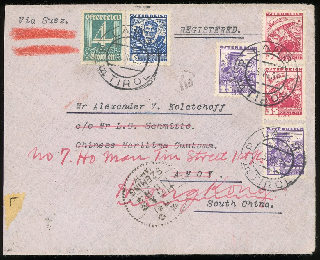 1935 (25 Jul.) a incoming cover from Austria to Amoy via Suez, Bangkok and Szeming arrival (6 Sep) c.d.s. then redirect to Hong Kong.
