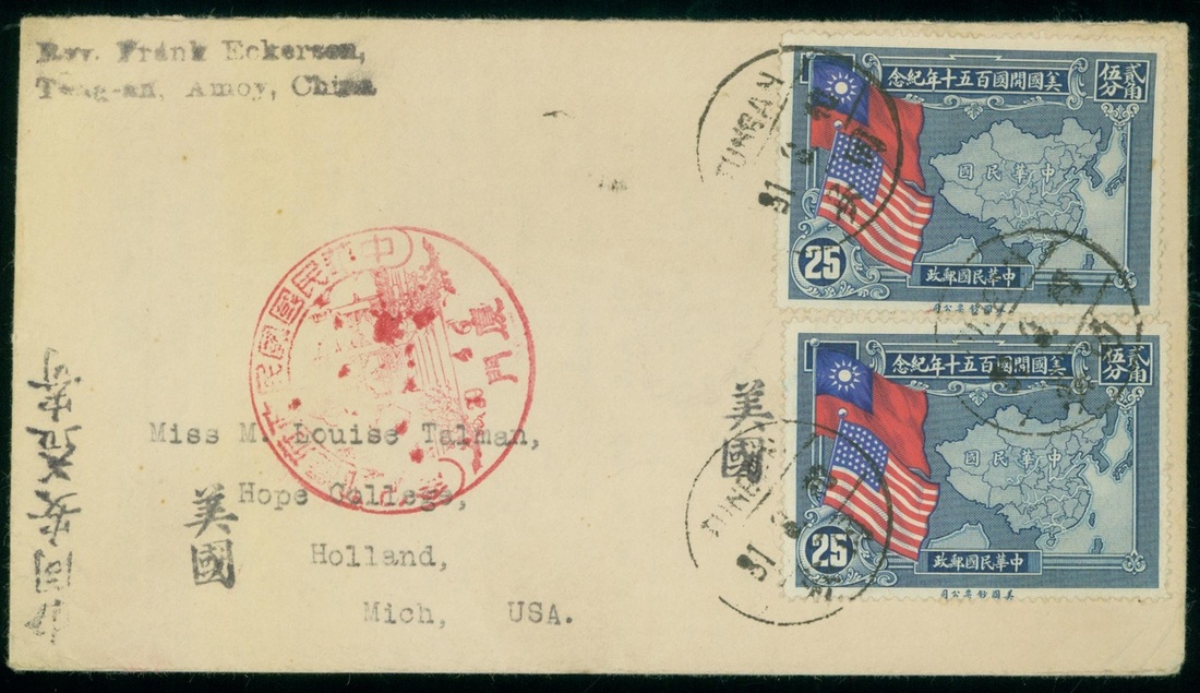 1940 (31 Mar.) envelope to USA bearing Chinese and U.S. Flags and Map of China 25c (2) tied by Tungan c.d.s.with Amoy commemorative chop, transit via Amoy which has been occupied by Japanese, rare postal route.