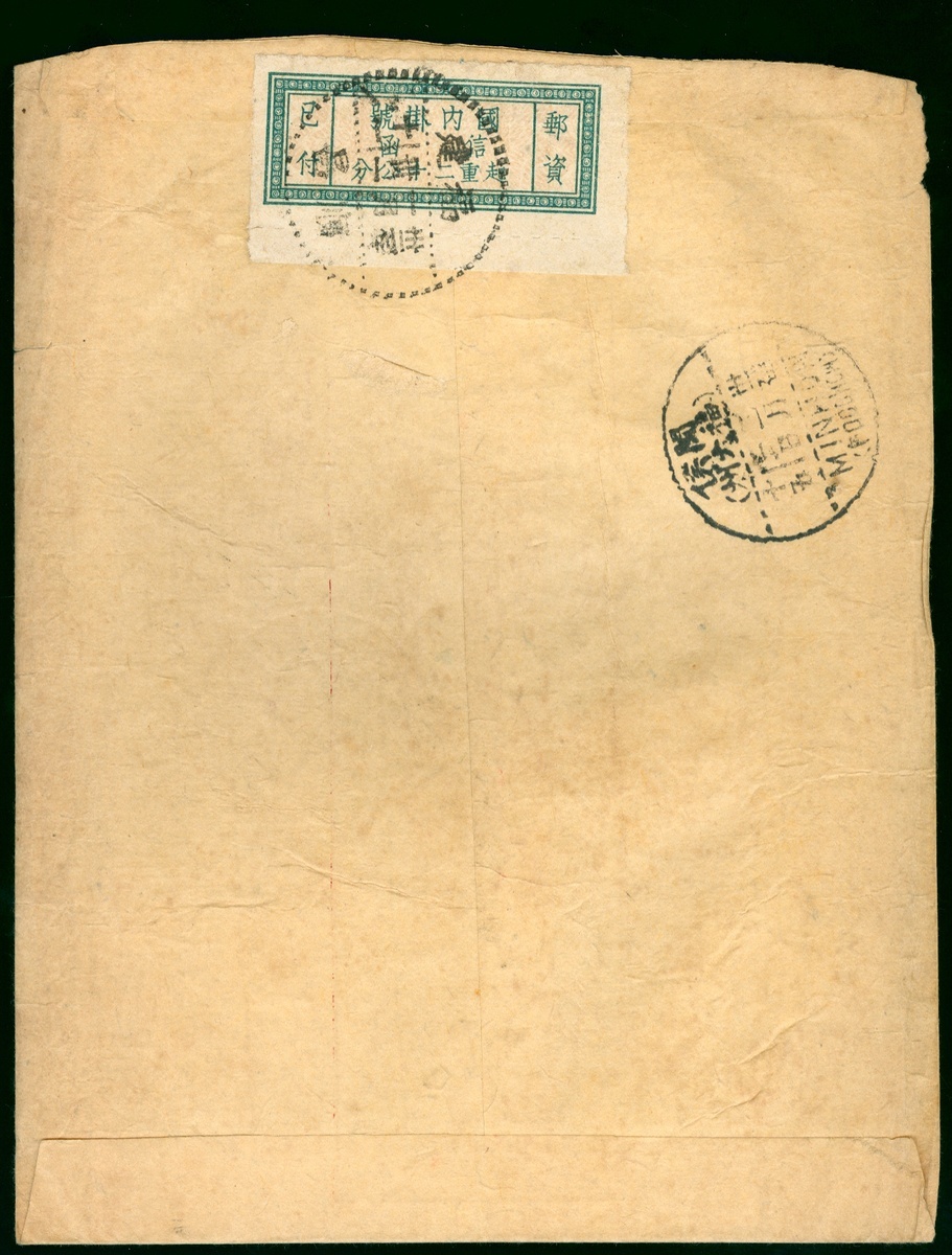1943 (31 Jan.) Shunchang to Foochow registered red band envelope, on the reverse, bearing postage paid unit stamp, tied by Shunchang c.d.s., 3 Feb. Minhow (Foochow) arrival c.d.s. on both side of envelope.