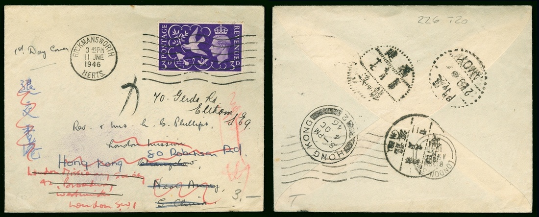 1946 (11 Jun.) Cover from Rickmansworth to London, than because recipient has moved, so this letter pass to Lungki Fukien China on 17 Sep., than transit with Amoy and Hong Kong transit c.d.s. At last the letter back to london on 15 Nov. a long journey letter with four times transit.