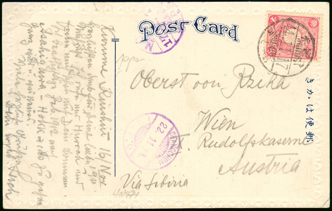 1911 (17 Nov.) a revolution picture postcard to Austria bearing 4s.tied by Japan c.d.s. via Siberia with blue Changchun IJPO(22 Nov.) transit c.d.s.
