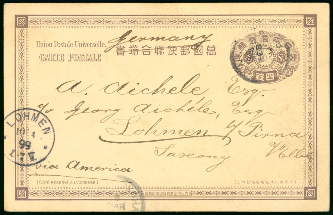 1899 (28 Feb.) Japan, Foreign Post Office in China, 4s Pre-stamped Picture Postcard, to Germany, tied by Shanghai c.d.s. and Lohmen arrival c.d.s.